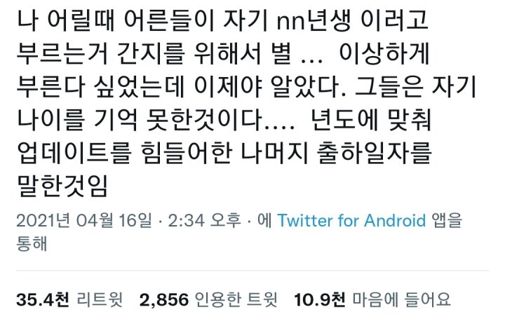 어른들이 자기 nn년생 이러고 부르는거!! 어른들이 자기 nn년생 이러고 부르는거!! 나이는 정말 어느 순간 특히 30대 중반만 넘어가면 이야기를 하기 싫어진다. 물론 나이를 어느 순간 까 먹는것도 있기도 하지만 그냥 내 나이가 들어간다는게 싫어서 직접적으로 나이를 이야기하는걸 꺼려진다. 그래서 정말 출생년도를 말하기 시작함. 즉,.. 나이 들어가는게 싫어서 저러는거지....아....나도 언제부터인가 내 나이를 말하는것보다는 저 몇년생이요 라고 이야기를 하는게 편함 공유하기 게시글 관리 재미난블로그 저작자표시 (새창열림) 요즘뜨는뿜