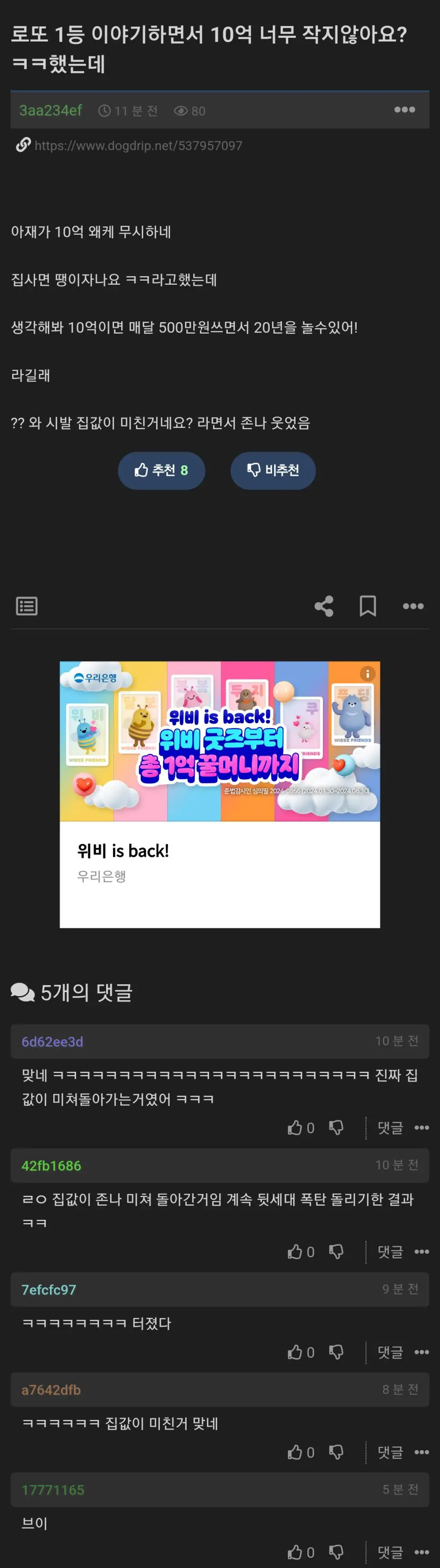 로또 1등 이야기하면서 10억 너무 작지 않아요? 했는데 로또 1등 이야기하면서 10억 너무 작지 않아요? 했는데 처음 했을때 몇백억 나오다가 10억 20억 이렇게 나오니깐 상당히 작아보이는게 맞기는 한데...일반인한테 평생 10억 모으라고 해도 사실 모으기 힘든 돈은 사실입니다 공유하기 게시글 관리 재미난블로그 저작자표시 (새창열림) 요즘뜨는뿜