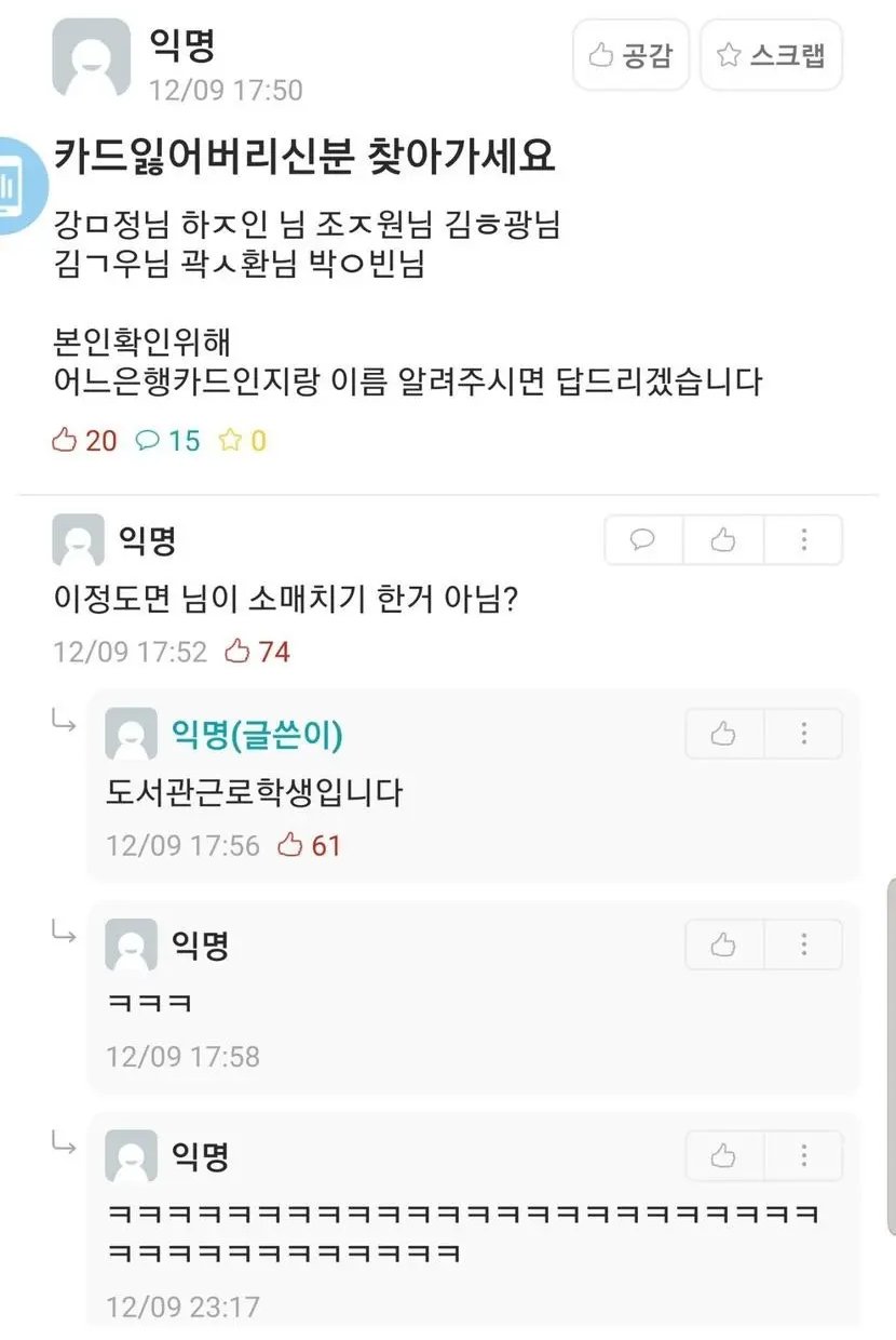 카드 잃어버리신 분 찾아가세요 카드 잃어버리신 분 찾아가세요 도서관에서 은근히 저렇게 카드를 많이 잃어버린다고? 저정도면 진짜 카드 수집가시다 ㅋㅋㅋ 저렇게 수집해서 다시 돌려주는것도 일인듯.... 공유하기 게시글 관리 재미난블로그 저작자표시 (새창열림) 요즘뜨는뿜