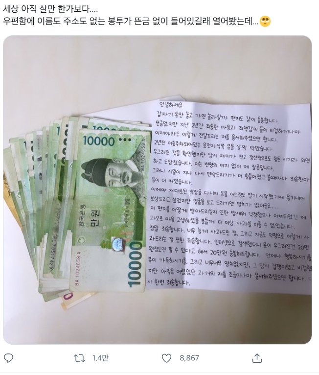 우편함에 20만 원이 들어있었어요...jpg 우편함에 20만 원이 들어있었어요...jpg 결혼식장서 '신부 불륜 영상' 공개한 남편(+불륜남 정체) 본인의 결혼식장에서 다른 남성과 불륜을 저지르고 있는 신부의 모습이 담긴 영상을 공개한 남편의 사연이 각종 온라인 커뮤니티 사이트 및 SNS 등을 통해 화제가 되면서 논란이 되고 있습니다. gog.k-idola.com 이래서 아직 세상은 살만한가라는 생각이 드는가 보다. 그래 늦게나마 죄를 알고 용서를 구하면 이해를 해주고 그래야지 어려운 시기에 말이야 그런데 여기서 반전은 만약에 집주인이 원래는 이사를 가고 1년 뒤에 새로운 사람이 이사를 와서 그냥 저걸 봤다면??? 20만원 개꿀 ㅋㅋ 공유하기 게시글 관리 재미난블로그 저작자표시 (새창열림) 요즘뜨는뿜