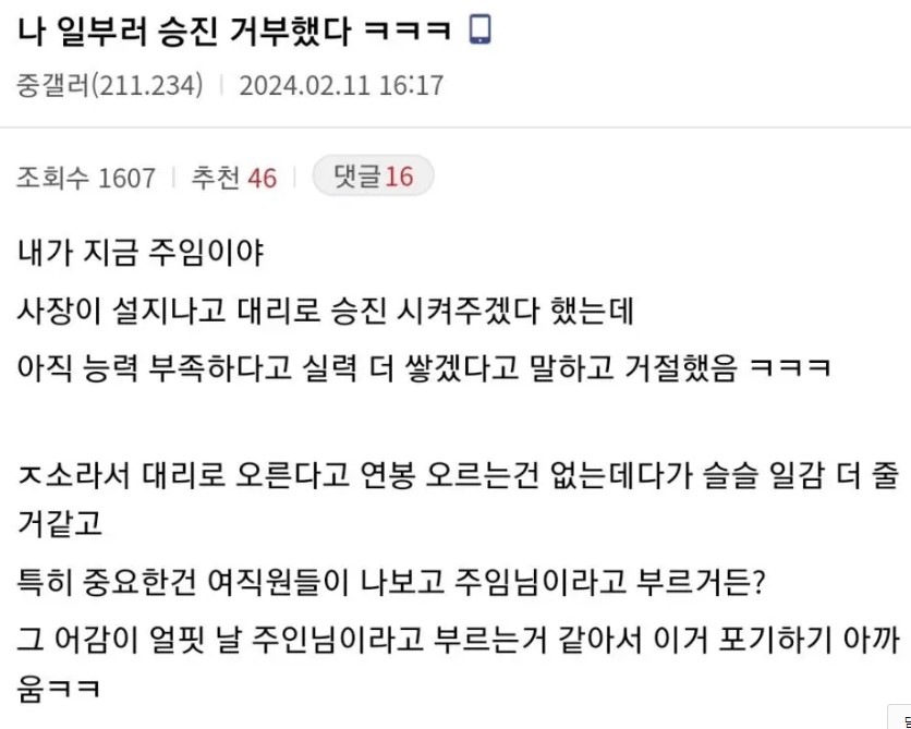 주임이 대리승진을 거부한 이유 주임이 대리승진을 거부한 이유 음...그냥 또라이였네 ㅋㅋㅋㅋ 물론 일은 더 시키고 월급은 안주면 승진을 거부하는게 맞는데...오직 그러한 이유라고 한다면 넌 그냥.... 공유하기 게시글 관리 재미난블로그 요즘뜨는뿜