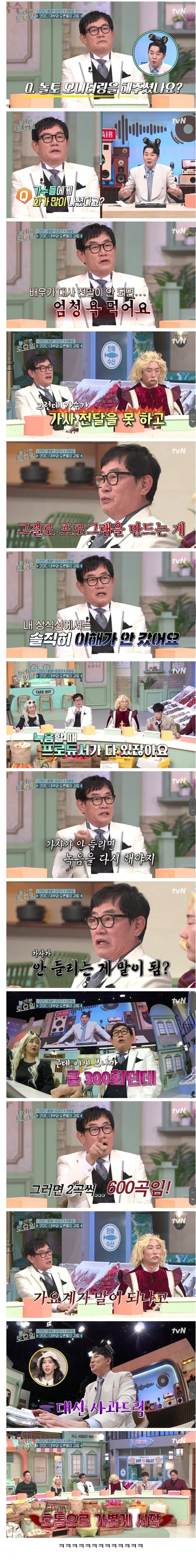 놀토 출연해서 요즘 가요계 호통치는 이경규 놀토 출연해서 요즘 가요계 호통치는 이경규 ㅋㅋㅋ 이게 맞는 말이지 랩퍼들은 가사가 얼마나 잘 전달되냐가 능력이고 실력인데 ㅋㅋㅋ 도대체 가수들은 어떻게 보내를 부르길래 가사전달력이 떨어지고 그걸 프로그램으로 만드냐 ㅋㅋㅋ 공유하기 게시글 관리 재미난블로그 요즘뜨는뿜