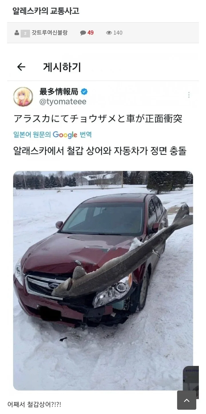 알래스카에서 일어날수있는 교통사고 ..JPG 알래스카에서 일어날수있는 교통사고 ..JPG 응? 지금 나보고 철갑상어랑 교통사고가 났다고 믿으라는거야? 아무리 상상력을 펼쳐도 도대체 저게 어떻게 가능한건지 이해가 안되는데? 공유하기 게시글 관리 재미난블로그 요즘뜨는뿜