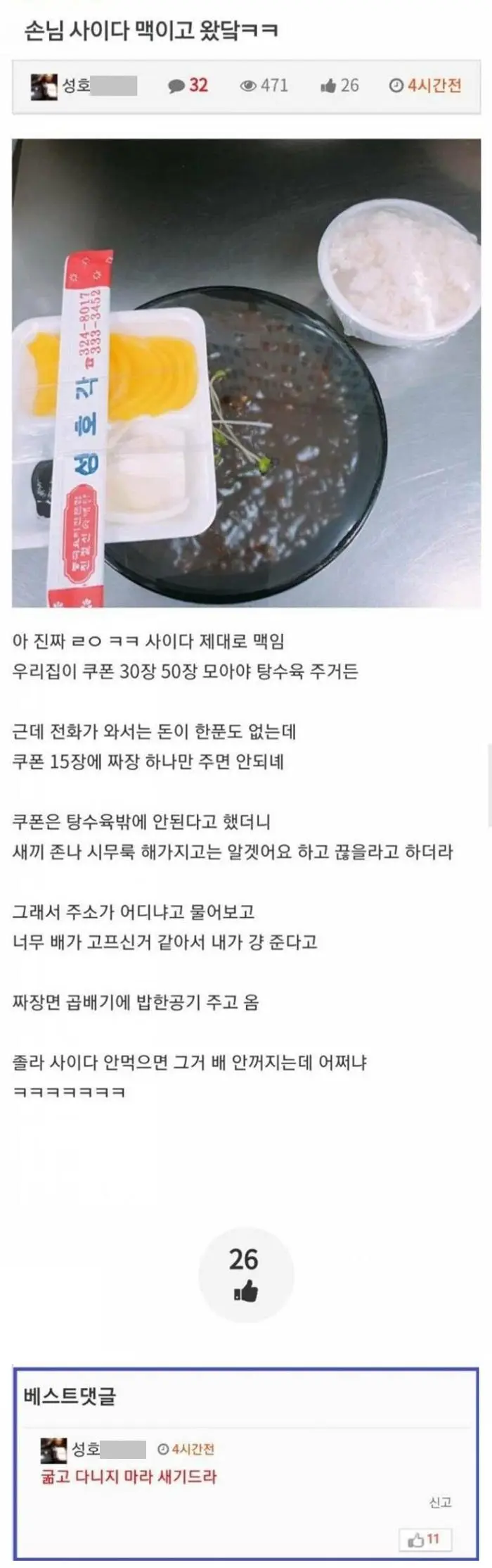 어느 중국집 사장님 인성.jpg 어느 중국집 사장님 인성.jpg 아니 거참 사장님 너무하네요!! 이런일 하실거면 상호를 가리시면 안되죠!! 상호를 알아야 거기가 어디인줄 알고 저도 가서 욕한바가지 시원하게 먹고 돈줄내고 올거 아닙니까!!! 공유하기 게시글 관리 재미난블로그 요즘뜨는뿜