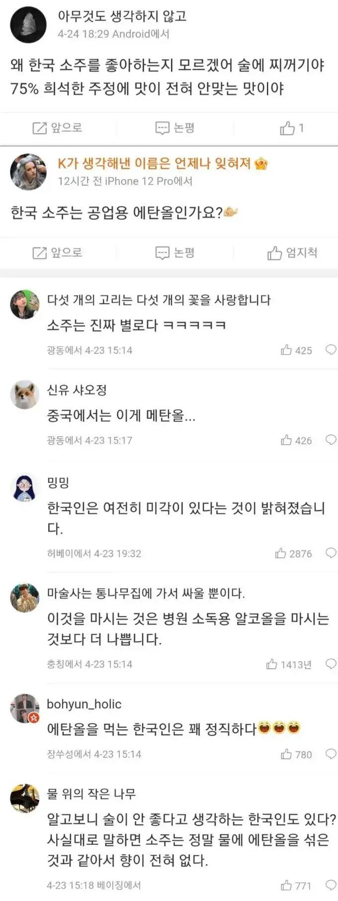 한국 제품이 수준 낮다고 까는 중국인들 한국 제품이 수준 낮다고 까는 중국인들 안동소주 맛을 본적있는데 입에챡 붙더군요 술을 즐기진 않으나 상당히 맛좋은 술이어씁니다 크~ 공유하기 게시글 관리 재미난블로그 요즘뜨는뿜