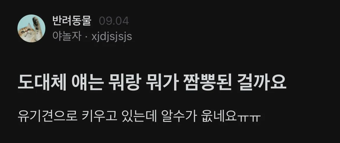 얘는 무슨 종이 짬뽕된 걸까요.jpg 얘는 무슨 종이 짬뽕된 걸까요.jpg 개인적으로 봤을때는 일단 말티즈와 함께 진돗개 스타일의 강아지가 믹스가 된거 같은데요. 왠지 얼굴은 어른이지만 몸은 아이와 같은 느낌으로 그래도 사랑스럽다는 생각이 드네요. 그런데 정말 궁금한거는 정말 "너 엄마 아빠는 누구니?" 공유하기 게시글 관리 재미난블로그 저작자표시 (새창열림) 요즘뜨는뿜